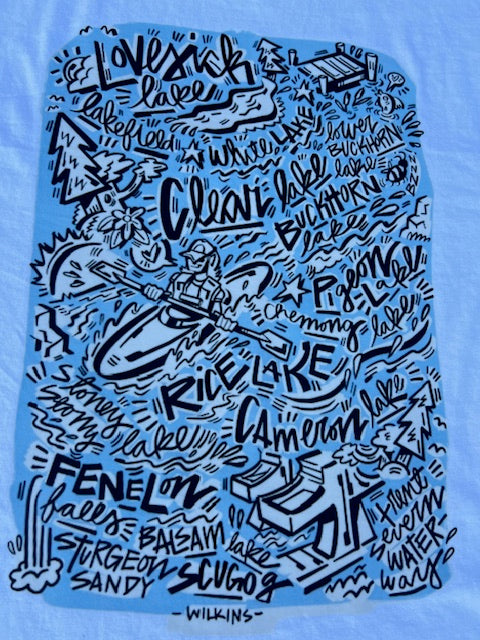 This is a special release of the full-colour background design by the talented Jason Wilkins—created just for Kawartha lake lovers. Jason packed this tee with local gems, lakes, and waterways in a Kawartha-style “Where’s Waldo.” From Clear and Stoney to Pigeon, Rice, and beyond—you’ll spot your favourites (and maybe a few surprises) hidden right in the artwork. And rumor has it… that paddler in the middle might just be me.